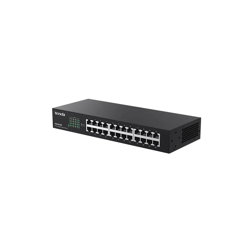 Tenda Switch 24 ports Gigabit robuste avec boîtier métal et ventilation silencieuse.